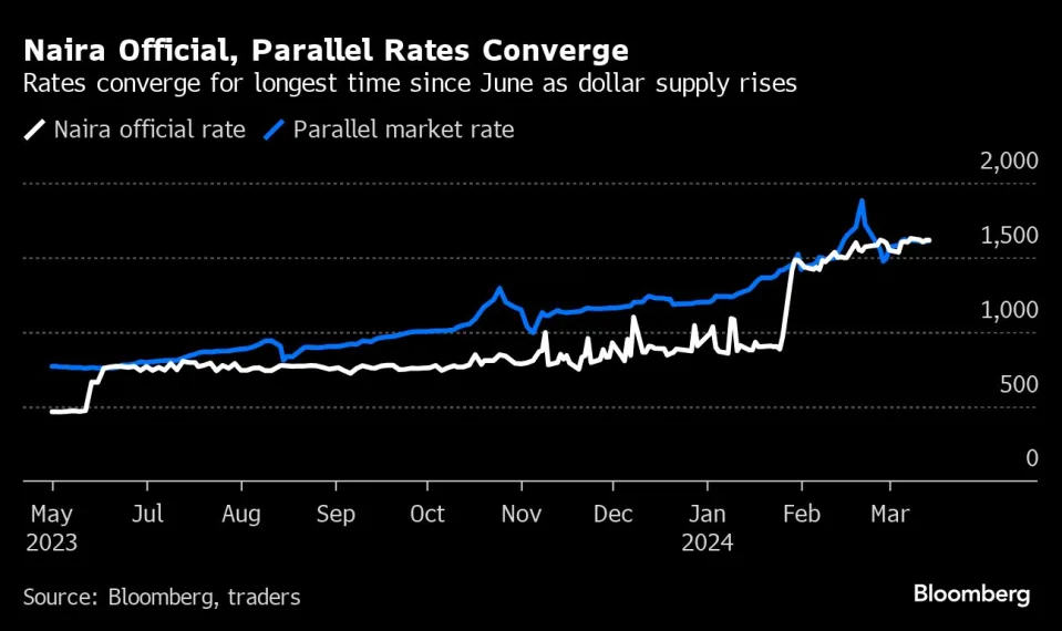 The naira was fixed at 1,615 per dollar on the official market on Wednesday, according to Lagos-based FMDQ, which tracks the data. The official rate has been within 3% either side of the parallel-market rate since last week, compared with a spread of more than 30% in January, before the central bank introduced measures to improve dollar liquidity. The parallel-market rate was 1,610 on Thursday.